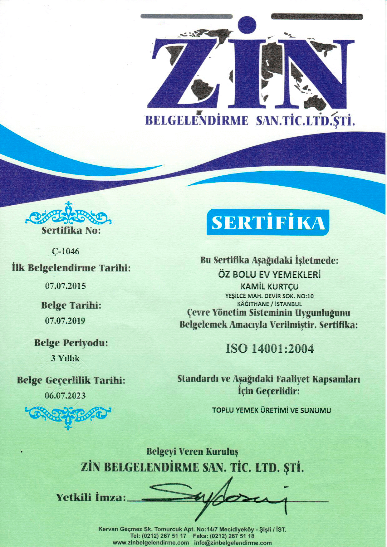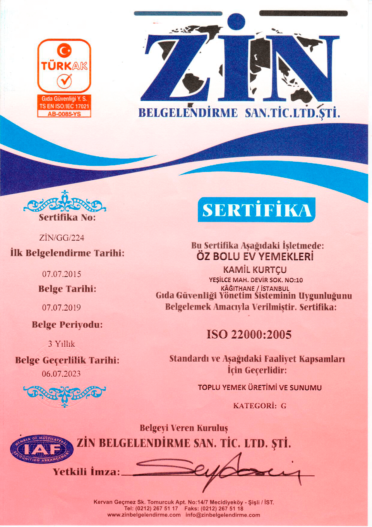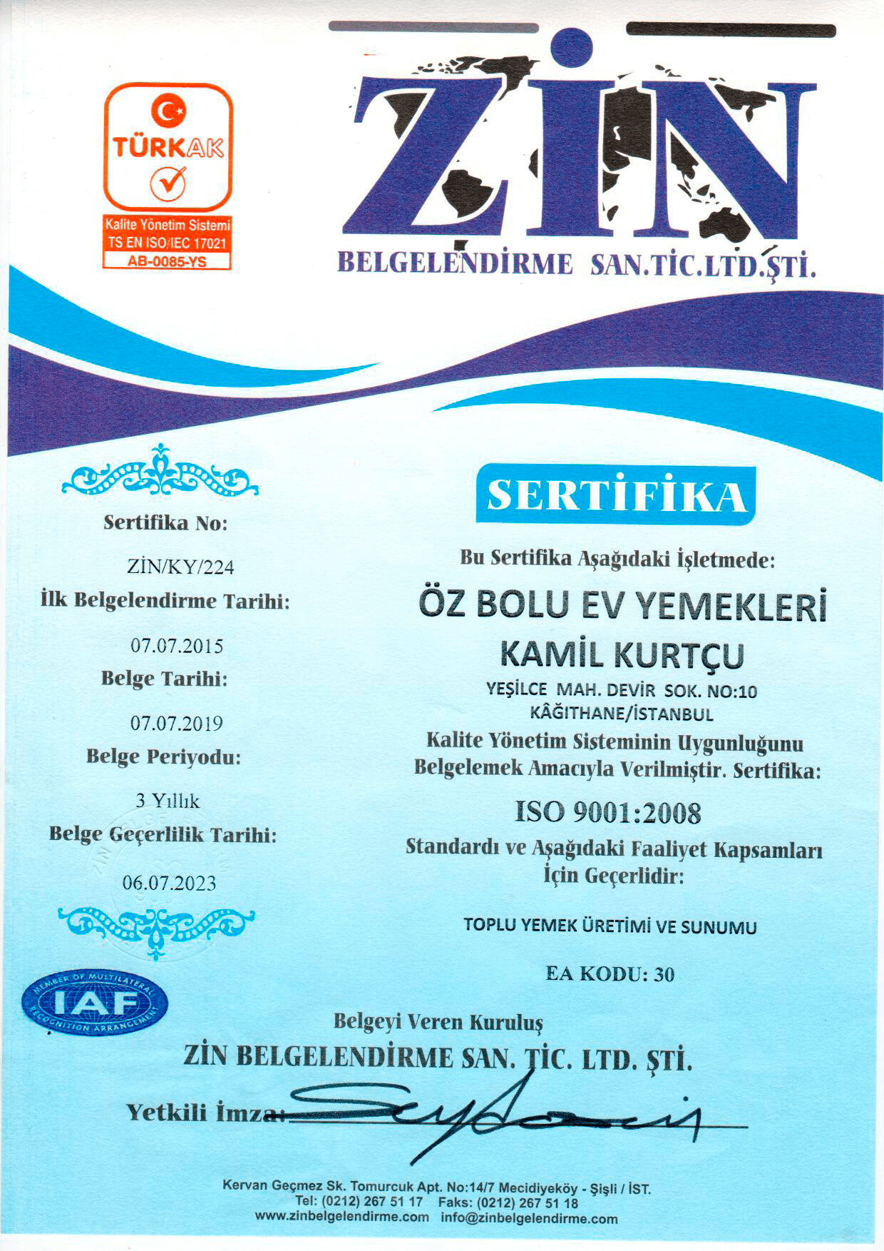 Öz Bolu Ev Yemekleri kalitesini ISO 9001, HACCP, OHSAS 18001, TSE, Gıda Sicil Sertifakaları ile belgelemiştir.